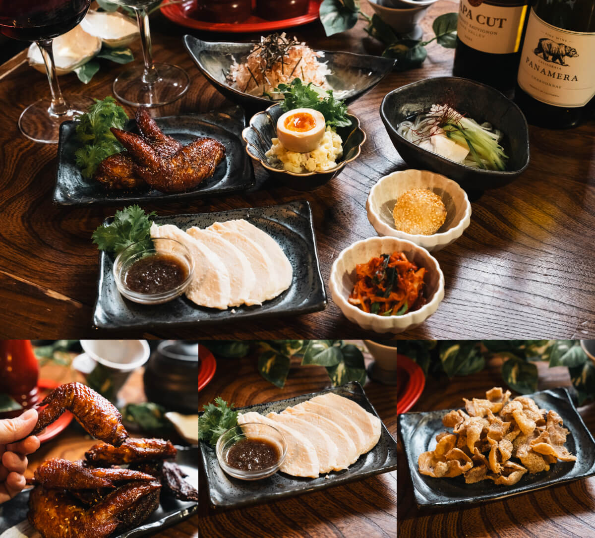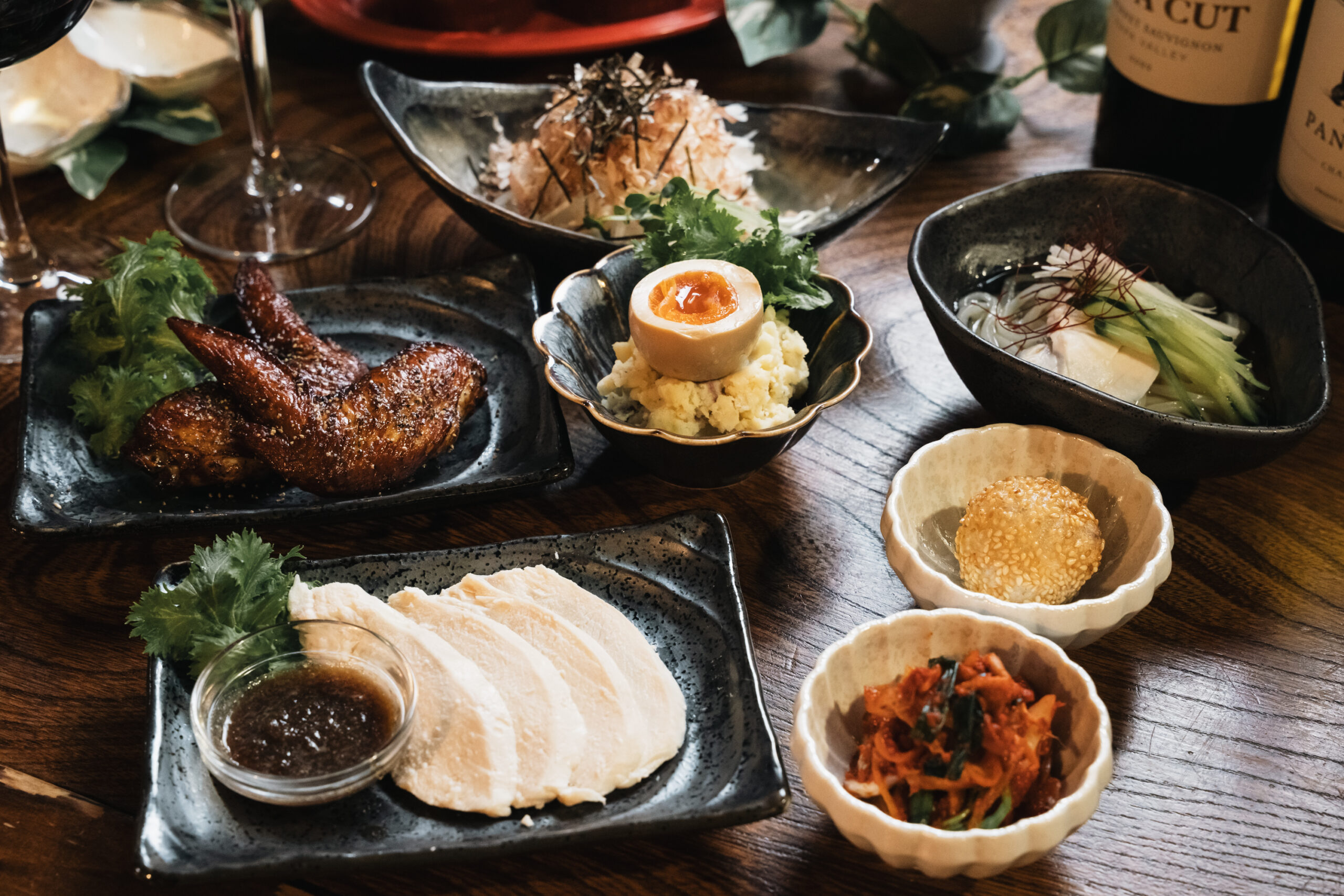 Japanese-Style Radish Salad/Potato Salad with Yamagata Smoked Egg/Homemade Kimchi/Special "Mogami-dori" Chicken Ham/Special "Mogami-dori" Chicken Wings/"Mogami-dori" Chilled Salt-Base Noodles/Sesame Dumplings